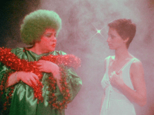 Working, almost around the clock, with the help of caffeine, and a few Dexedrines, David, Harriett, Shelley, myself, and a few PA’s assembled the sets out of the available building flats, constructed the fake windows, began the dressing process, and the absurdist Dickensian rooms began to take shape. David had constructed the skyline of lower Manhattan in forced perspective, made entirely out of corrugated cardboard, complete with tiny lights in the windows, that would become the view from Carol Scrooge’s bedroom window, where Marley’s Ghost, in the person of Marc Stevens, would first appear.